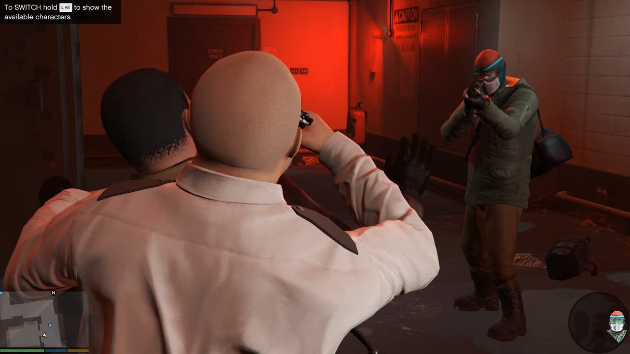 ให้เราเดินออกมาด้านนอก แล้วกำจัดพวกตำรวจให้หมด ระหว่างที่เรากำลังยิงตำรวจอยู่นั้น ตัวที่เราบังคับอยู่ (ใส่หมวกสีเขียวแดง) ก็จะดึงหมวกที่ใส่อยู่ออก ทำให้เรารู้ว่าแท้จริงแล้ว ก็คือเทรเวอร์ (Trevor ตัวเอกอีกตัวในภาคนี้) นั่นเอง